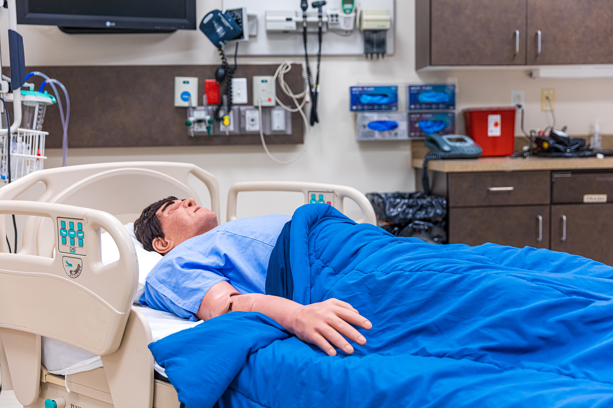 The 12,000 square foot facility features six clinical learning areas: ICU Room, ER Room, Medical-Surgery Room, OB/Delivery Room, Pediatric Room, and Home Environment Room.
